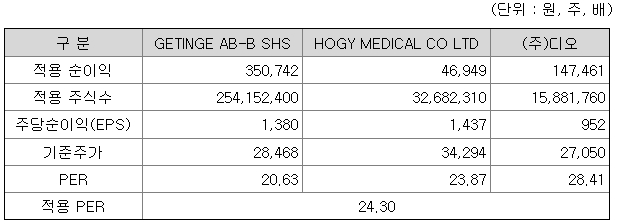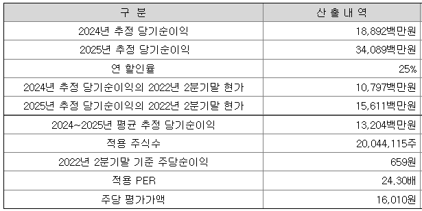 회사의 주당 평가가액은 2024년과 2025년의 추정 순이익을 2022년 반기말 현재로 현가 할인하여 환산 후 유사회사의 평균 PER를 적용하여 산출한 것입니다.