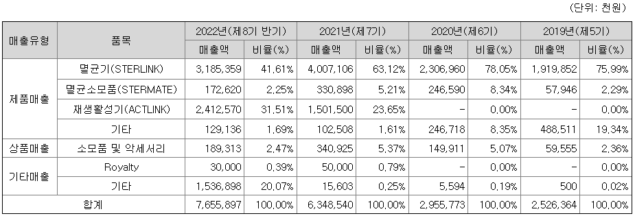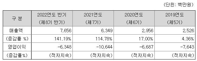 동사의 매출액은 2019년 25.3억원에서 2021년 63.5억으로 신장하고 있고, 특히 2022년 반기 매출은 76.6억원으로 2021년 연간 매출을 이미 초과한 실적입니다.
