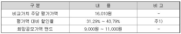 플라즈맵의 공모희망가격은 회사의 주당 평가가액 16,010원에서 43.79% ~ 31.29%를 할인한 가격입니다.
