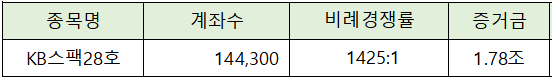 KB스팩 28호의 청약에는 1.78원의 증거금이 모이면서 1425 : 1의 비례 경쟁률을 나타냈습니다.