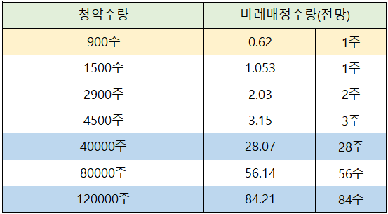일반 청약자의 최고 청약 한도인 40000주까지 풀 청약 신청한 경우에는 28주 배정이 예상되며, 최우대등급 최고한도인 120000주까지 청약 신청한 경우 84주 배정이 전망되고 있습니다.