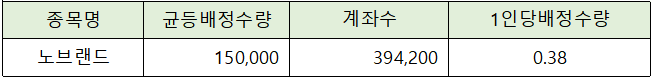 균등 배정은 총 394,200 계좌가 청약에 참가해 균등 배정 수량 150,000주를 감안하면 1인당 0.38주가 배정될 것으로 전망되고 있습니다. 균등으로 1주 배정받을 수 있는 확률이 38%에 불과해 1주 배정이 매우 어려울 전망입니다.