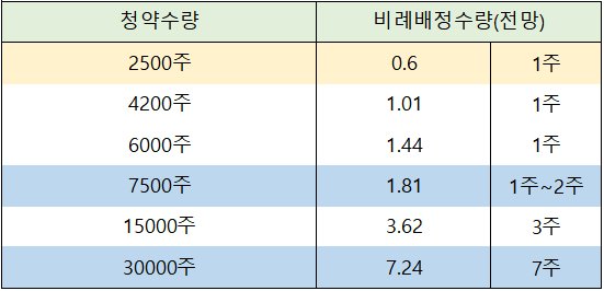 우대등급 최고 청약 한도인 30000주까지 풀 청약 신청한 경우에는 7주 배정이 예상됩니다.