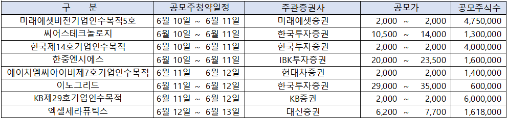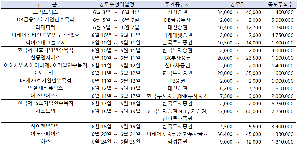 오늘 현재까지 파악된 2024년 6월 공모주는 스팩 포함 시 17곳이고, 스팩 제외 후 일반 공모주 청약은 13곳이 청약을 준비 중인 것으로 나타났습니다.