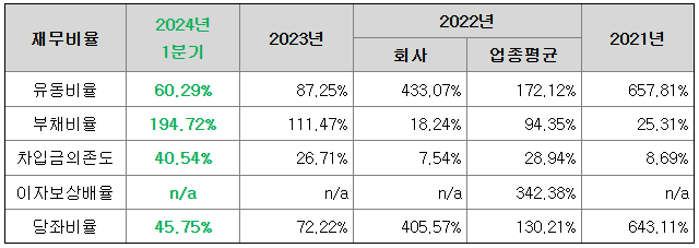 부채비율과 차입금 의존도는 2021년, 2022년 유상증자 효과로 업종평균 대비 낮은 수준을 유지하였으나, 2023년 당기순손실 발생과 사무실 이전에 따른 리스부채 증가, 단기차입금 증가 효과로 2024년 1분기 기준 부채비율은 194.72%, 차입금의존도는 40.54%로 증가하였습니다. 이자보상배율은 2021년부터 증권신고서 제출일 현재까지 영업이익을 창출해내지 못하고 있어, 음의 이자보상배율 값을 보이고 있습니다.