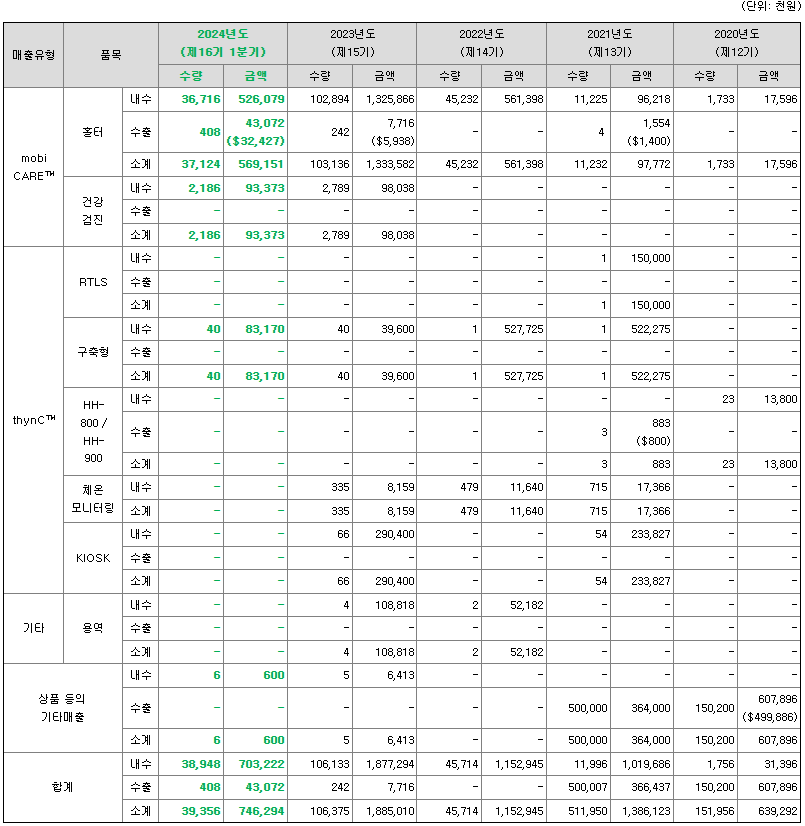 무선 웨어러블 의료기기와 인공지능 기술을 활용한 환자모니터링 분야에서도 사업영역 확대가 이뤄지고 있습니다. 입원환자 실시간 모니터링 서비스를 중심으로 병원전단계 응급환자 모니터링, 의료기관 간 비대면 협진, 입원환자 실시간 위치 모니터링, 퇴원환자 재택 모니터링 등 환자 진료 전주기를 포괄하는 플랫폼 기반의 원격 환자모니터링 서비스를 제공하고자 합니다. 특히 당사는 순환기병동, 신경과병동, 호흡기병동, 암병동 등 일반병동과 투석실, 뇌졸중집중치료실, 심장재활실, 응급실, 격리병실, 중환자실 등 다양한 진료과의 입원환자들을 대상으로 상용화를 진행하면서 구축형과 구독형 요금제를 결합하여 서비스 플랫폼을 강화시켜 나가고 있습니다.