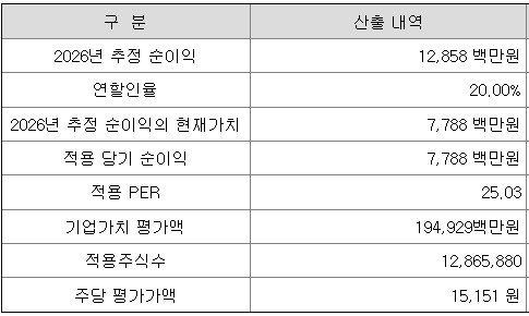 회사의 주당 평가가액은 2026년 추정 순이익을 할인하여 현재가치로 환산한 후, 유사회사의 평균PER배수를 곱하여 ㅗ회사가치를 정하고, 이를 주식수로 나누어 산출한 것입니다.