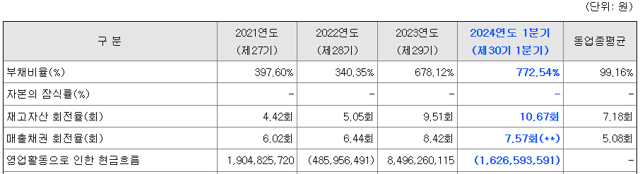 냉각시스템 모듈의 조립·생산 라인 구축에 대규모 자금이 소요되었으며, 제3공장을 증축하면서 약 120억원의 리스부채가 증가하였습니다. 2023년의 경우 장단기차입금의 유의적인 증가는 없었으나, 결손금 누적으로 인하여 부채비율은 약 678% 수준으로 악화되었습니다. 이러한 높은 부채비율과 재무안정성을 제고하기 위하여 월별 부채상환계획을 수립하여 검토하고 있으며, ESS사업을 통한 수익구조 개선에 따른 영업현금흐름개선 및 수익성 증대를 기대하고 있습니다.