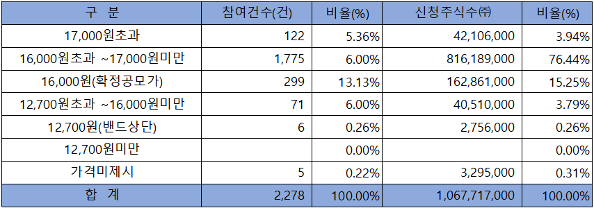 희망가격 상단 이상 초과 신청 비율은 99.69%였으며, 확정 공모가 16,000원 이상 신청 비율도 95.64%에 달했습니다.