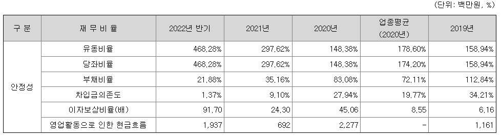2020년 전환사채와 전환상환우선주를 만기 상환하고, 2022년 상반기 중 장단기 차입금을 모두 상환하여 차입금 의존도 제로에 가까운 수준입니다.