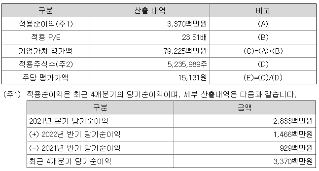 회사의 주당 평가가액은 최근 4분기 당기 순이익을 바탕으로 주당 순이익을 구한 다음 유사회사의 P/E배수를 적용하여 산출한 것입니다.