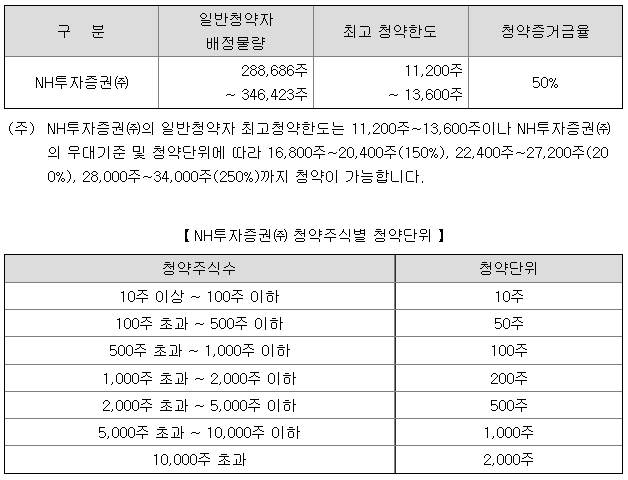 NH투자증권의 일반 청약자 배정은 288,686주 ~ 346,423주이고, 일반 그룹의 청약 한도는 11,200주 ~ 13,600주입니다.