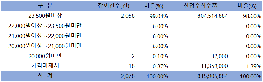 수요예측 참여 건수는 총 2,078건에 신청 주식수 815,905,884주로, 참여 경쟁률 725.94 : 1의 실적을 기록했습니다.