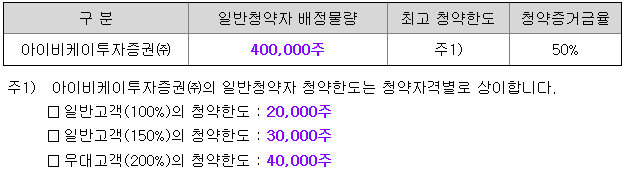IBK투자증권의 일반 청약자 배정 물량은 400,000주이고, 일반 청약자의 최고 청약 한도는 일반 고객 기준 20,000주입니다.