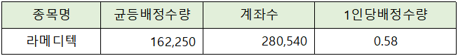 라메디텍은 총 280,540계좌가 청약에 참가해 균등 배정 수량 162,250주를 감안하면 1인당 0.58주가 배정될 것으로 전망되고 있습니다. 즉 균등 배정을 1주를 배정 받늘 확률이 58%라는 뜻입니다.