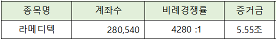 라메디텍의 청약에는 5.55조원의 증거금이 모이면서 비례경쟁률 4280 : 1의 높은 경쟁률을 나타냈습니다.