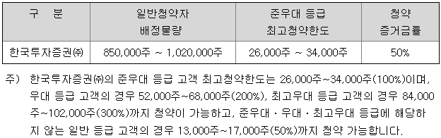 한국투자증권의 일반 청약자 배정 물량은 850,000주 ~ 1,020,000주이고, 일반 청약자의 최고 청약 한도는 일반 등급 기준 13,000주  ~  17,000주입니다.
