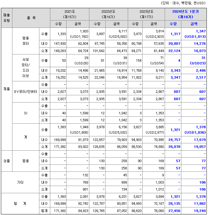 범용 전동기의 경우 중국 청도에 소재한 자회사인 모터부품 공장을 기반으로 가격 경쟁력을 확보하였으며, 지속적인 연구개발을 통해 확보한 기술경쟁력을 가지고 있습니다. 신고서 제출일 현재 국내 범용전동기 시장에서 효성중공업, HD현대일렉트릭에 이어 3위의 점유율을 가지고 있으며, 국내 모터 강소 기업으로 자리매김하고 있습니다.