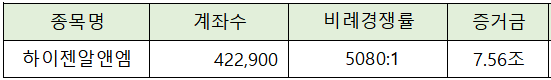 하이젠알앤엠의 청약에는 7.56조원의 증거금이 모이면서 5,080 : 1의 높은 비례 경쟁률을 나타냈습니다.
