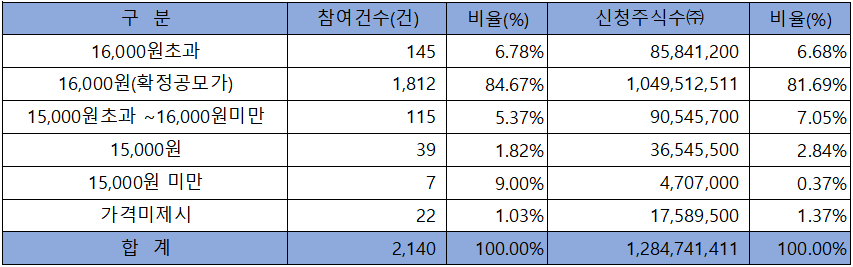 희망가격 상단 이상 신청 비율이 대부분이었으며, 확정 공모가 16,000원 이상 신청 비율도 88.37%에 달했습니다.