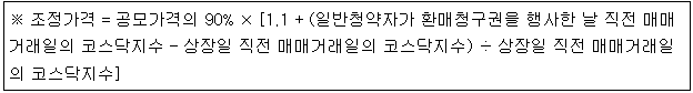단, 환매청구 행사일 직전 매매거래일의 코스닥 지수가 상장일 직전 매매거래일의 코스닥 지수에 비해 10%이상 하락한 경우에는 조정 가격이 적용됩니다.