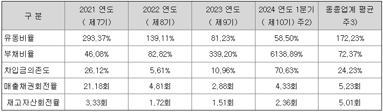 동사는 외부 투자 유치를 통한 자금을 바탕으로 첨단바이오의약품에 적합한 세포 배양배지 연구개발과 생산을 수행하고 있으며, 이에 따라 동사의 유동자산은 대부분 현금 및 현금성 자산으로 구성되는데, 외부 투자 유치가 많았던 2021년을 기점으로 유동비율이 감소하였습니다.