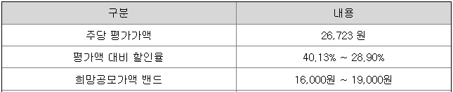 뱅크웨어글로벌의 희망 공모가격은 회사의 주당 평가가액 26,723원에서 28.90% ~ 40.13% 할인한 가격입니다.
