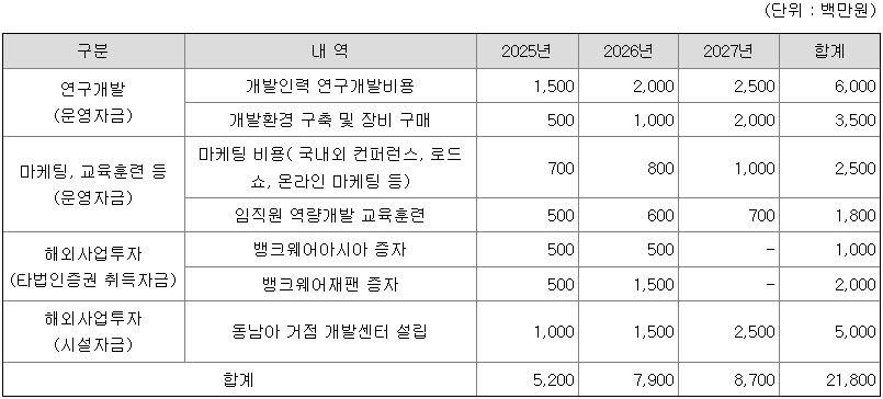 뱅크웨어글로벌은 금번 공모를 통해 조달된 자금으로 연구개발에 95억, 해외사업투자에 80억을 사용하고, 나머지 43억을 운영자금으로 사용할 계획입니다.