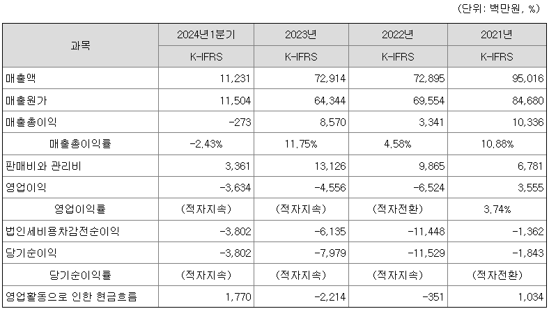 설립 이후 급성장세를 보였지만 최근에는 매출액도 줄고 수익성도 적자 상태입니다.