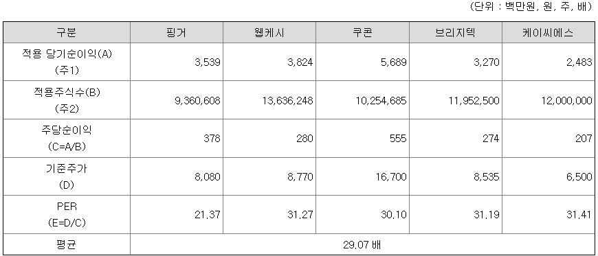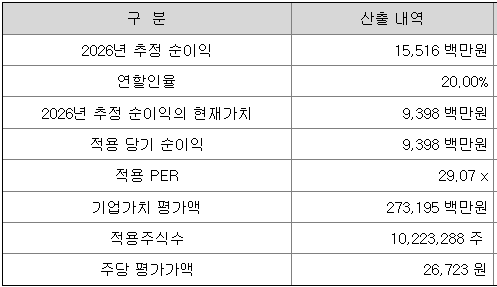회사의 주당 평가가액은 2026년 추정 순이익을 할인하여 현재가치로 환산한 후, 유사회사의 평균 PER배수를 곱하여 회사가치를 정하고, 이를 주식수로 나누어 산출한 것입니다.