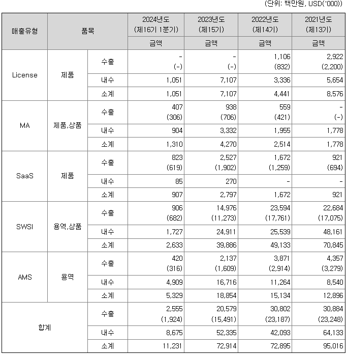 또한 금융 및 플랫폼 소프트웨어 패키지를 공급하고 동 소프트웨어를 기반으로 고객 요구사항을 맞춤 개발하는 소프트웨어 시스템 구축사업을 수행하고 있으며, 동사가 구축한 애플리케이션 시스템을 운영관리 하는 애플리케이션 관리서비스도 수행하고 있습니다