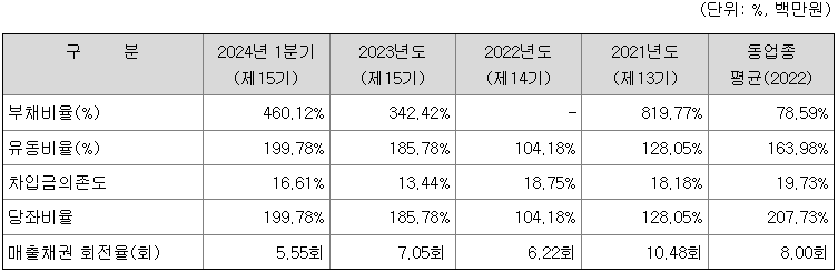 차입금의존도는 `22년말 18.75% → `24년 1분기말 16.61%로 2.14% 감소하였습니다. 또한, 부채총계가 2022년 말 522억원 대비 2023년 말 348억원으로 큰 폭으로 개선되었고, 부채비율은 342.42%를 기록하였습니다. 2023년 하반기부터 진행된 신규 프로젝트 수주 및 공모자금 유입 효과로 재무안정성 지표는 개선을 기대하고 있습니다.