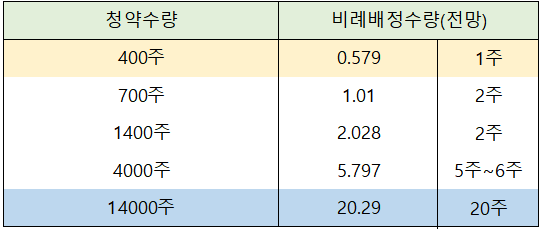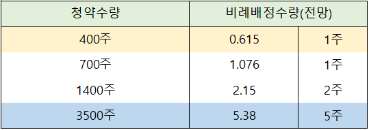 즉 400주를 신청해야 57.9% ~ 61.5%의 확률로 1주를 배정받을 수 있는 것입니다.