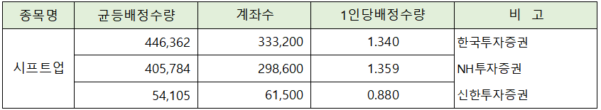 증권사별 균등 배정 결과는 아래 표와 같습니다.