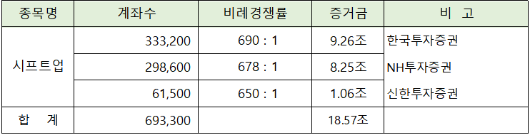 시프트업의 청약에는 3개 증권사를 합해서 볼 때 총 18.57조원의 증거금이 모이면서 650 : 1 ~ 690 : 1의 비례 경쟁률을 나타냈습니다.