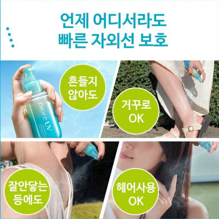 잘 닿지 않는 등에도 뿌릴 수 있고 머릿결에 뿌려도 문제가 없는 미스트형 제품인데, 자외선 차단 효과도 탁월하니 여름철 필수품이 되고 있다네요.