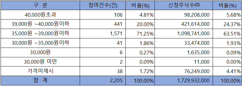 수요예측 참여 건수는 총 2,205건에 신청 주식수 1,729,932,000주로, 참여 경쟁률 413.86 : 1의 경쟁률을 기록했습니다.