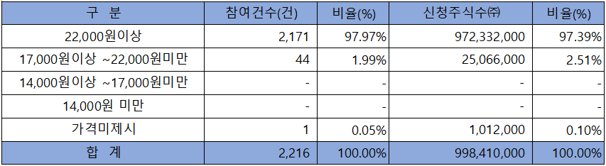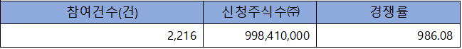 수요예측 참여 건수는 총 2,216건에 신청 주식수 998,410,000주로, 참여 경쟁률 986.08 : 1의 실적을 기록했습니다.