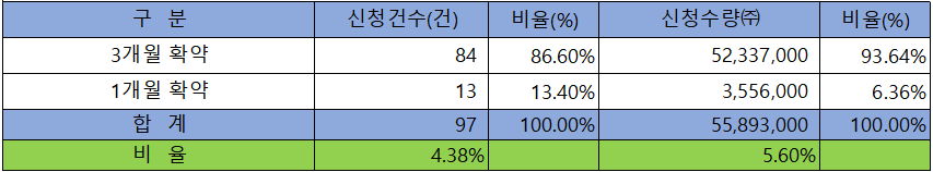 의무 보유 확약 건수는 97건에 55,893,000주로 전체 신청 물량 대비 건수로는 4.38%, 수량으로는 5.60%였으며, 3개월 확약 비중이 제일 높았습니다.