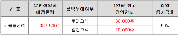 키움증권의 일반 청약자 배정 물량은 337,500주이고, 일반 청약자의 최고 청약 한도는 일반 고객 기준 20,000주입니다.