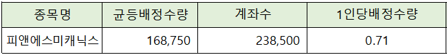 균등배정은 총 238,500 계좌가 청약에 참가해 균등 배정 수량 168,750주를 감안하면 1인당 0.71주가 배정될 것으로 전망되고 있습니다.