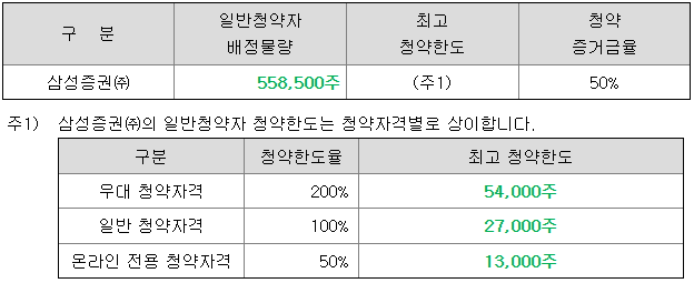 삼성증권의 일반 청약자 배정 물량은 558,500주이고, 일반 청약자의 최고 청약 한도는  온라인 전용 고객 기준 13,000주입니다.