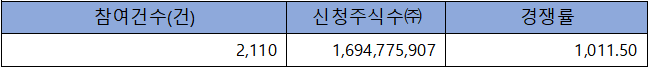 수요예측 참여 건수는 총 2,100건에 신청 주식수 1,694,775,907주로, 참여 경쟁률 1,011.50 : 1의 실적을 기록하였습니다.
