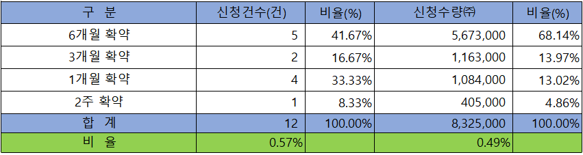 의무 보유 확약 건수는 12건에 8,325,000주로 전체 신청 물량 대비 건수로는 0.57%, 수량으로는 0.49%였으며, 제시 가격에 비해 의무 보유 확약 내용은 좋지 않게 나타났습니다.