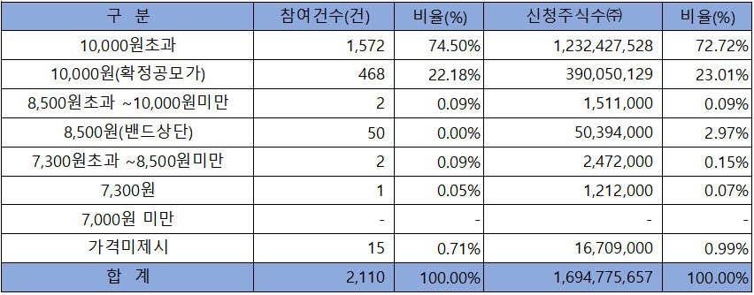 희망 공모가격 상단 이상 신청 비율은 98.80%였으며, 확정 공모가 10,000원 이상 신청 비율도 95.73%에 달했습니다.