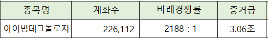 아이빔테크놀로지의 청약에는 3.06조원의 증거금이 모이면서 2,188 : 1의 비례 경쟁률을 나타냈습니다.