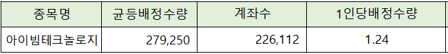 균등 배정은 총 226,112 계좌가 청약에 참가해 균등 배정 수량 279,250주를 감안하면 1인당 1.24주가 배정될 것으로 전망되고 있습니다.