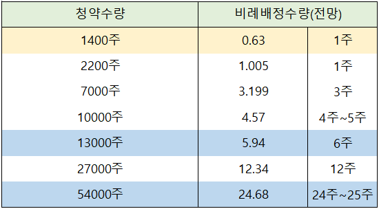 우대등급 청약 한도인 27,000주와 54,000주 청약 신청한 경우는 각각 12주와 24주 ~ 25주 배정이 예상되고 있습니다.