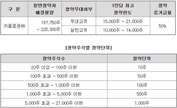 키움증권의 일반 청약자 배정 물량은 187,750주 ~ 225,300주이고, 일반 청약자의 최고 청약 한도는 일반 고객 기준 10,000주 ~ 14,000주입니다.
