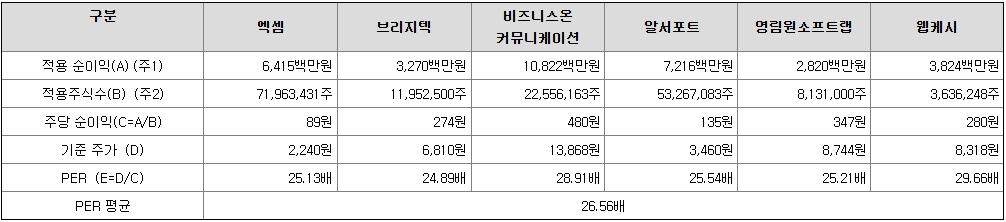 회사의 주당 평가가액은 2024년 1분기 시준 지건 12개월의 순이익을 주식 수로 나누어 주당 순이익을 구하고, 여기에 유사회사의 평균 PER배수를 곱하여 산출한 것입니다.